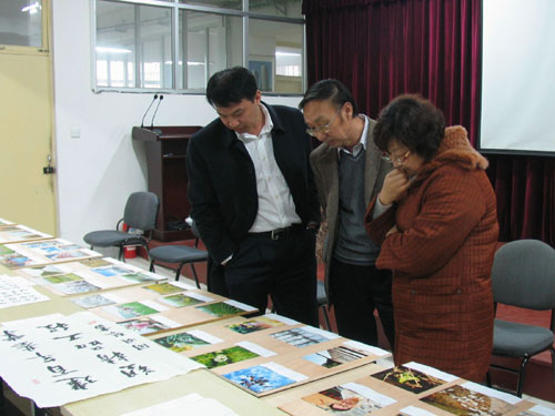 喜迎企業(yè)60年首屆書畫攝影展——專家評審組認真審閱作品