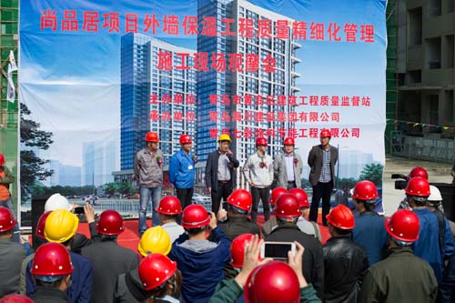 觀摩會(huì)當(dāng)天,集團(tuán)副總裁馬志驍、七分公司總經(jīng)理朱超等陪同黃島區(qū)質(zhì)監(jiān)站領(lǐng)導(dǎo)進(jìn)行了現(xiàn)場觀摩,上午9:00黃島區(qū)質(zhì)監(jiān)站領(lǐng)導(dǎo)主持了現(xiàn)場觀摩會(huì),對照實(shí)體樣板詳細(xì)講解保溫工程各工序質(zhì)量保證要點(diǎn)。主要就工程實(shí)體保溫工程界面劑噴涂、玻纖網(wǎng)粘貼、加強(qiáng)層粘貼、窗洞口巖棉套割、錨栓固定等施工工藝進(jìn)行了講解并宣布現(xiàn)場觀摩開始。黃島區(qū)各與會(huì)單位人員現(xiàn)場觀摩了實(shí)體工序樣板,各單位間相互切磋工藝做法,交流標(biāo)準(zhǔn)化管理經(jīng)驗(yàn)。上午11:00觀摩人員陸續(xù)離開施工現(xiàn)場,現(xiàn)場觀摩會(huì)圓滿結(jié)束。